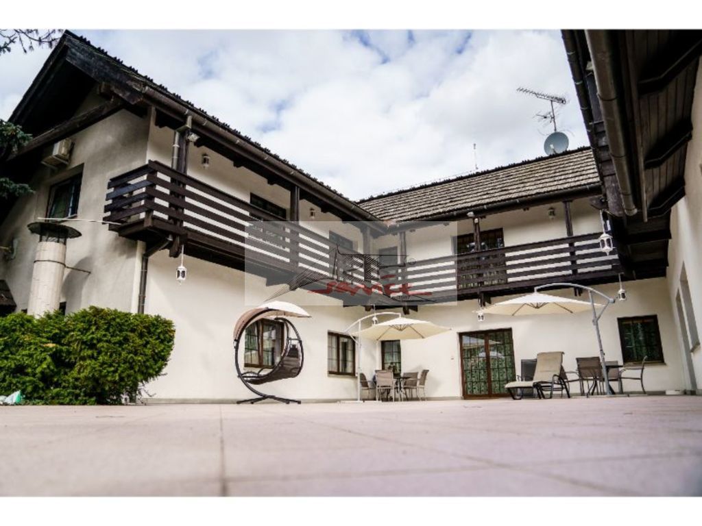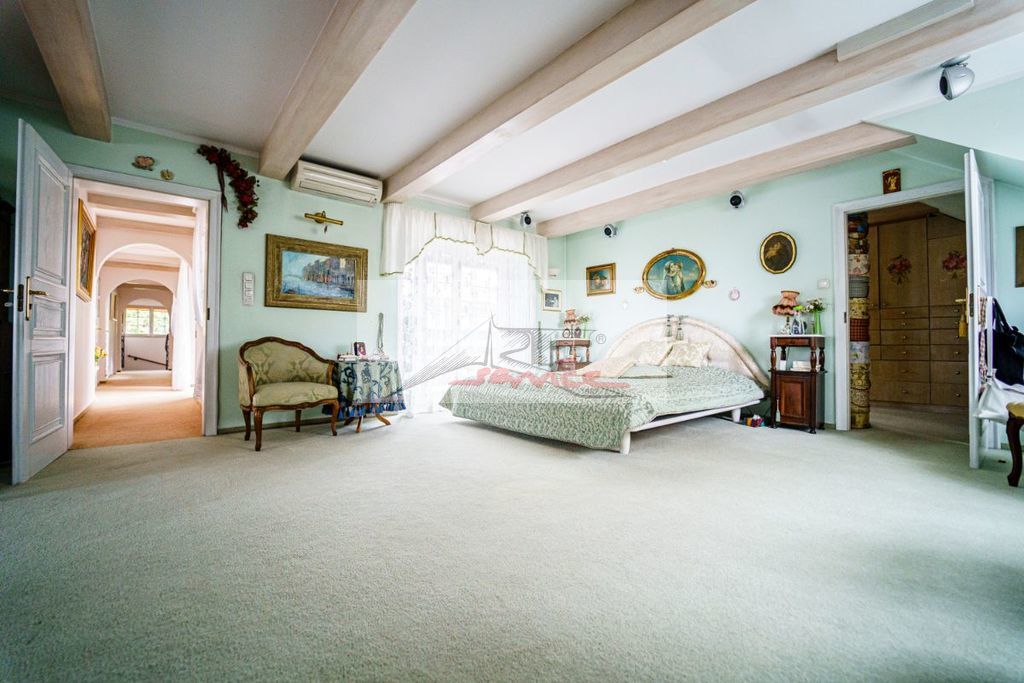 Dom posiada 4 kondygnacje przyziemie, parter, piętro oraz strych (nie liczony w powierzchni). Pierwsze piętro to część ściśle prywatna. Tu znajdują się m.in. 3 ogromne sypialnie (jedna z prywatną łazienką oraz garderobą), salon kąpielowy i pokój gościnny. Wszystkie sypialnie posiadają wykładziny, a łazienki mają podgrzewane podłogi. Pokoje połączone są również ciągiem balkonowym w typie krużganka, znajdującego się nad tarasem. Parter jest przestrzenią niezwykle reprezentacyjną. Po wejściu do domu, przechodząc przez hall wchodzimy do dwóch ogromnych salonów (90 m2) połączonych ze sobą w amfiladzie. Obok znajduje się obszerna kuchnia z jadalnią i spiżarnią (31 m2). Na parterze znajduje się również łazienka, pokój gościnny oraz niezwykle duży gabinet/biblioteka (55 m2). Podłogi na tym piętrze są drewniane (dąb, bambus) i marmurowe. Podłogi kamienne są podgrzewane. Wysokość pomieszczeń parteru to 292 i 335 cm. Dom ma układ litery "U", więc z obu salonów czy hallu można wyjść na przestronny taras-patio. Można tam usiąść, napić się kawy i podziwiać piękny ogród w niezakłóconej, intymnej atmosferze. Wielkość tarasu (ok 150 m2) pozwala na wygodne urządzanie dużych przyjęć plenerowych - kamienne szerokie schody prowadzą do głównej części ogrodu. Centralnie pod trasem został umiejscowiony nowoczesny, duży basen o wymiarach 12.5 na 4 m. Hala basenowa jest klimatyzowana i wentylowana za pomocą profesjonalnej centrali klimatyzacyjnej Menerga. Woda jest niezależnie podgrzewana, a w pomieszczeniu panuje zadana temperatura i wilgotność. Z basenu można wyjść bezpośrednio do ogrodu. Obok basenu znajduje się sala kinowa z nagłośnieniem Dolby Atmos, siłownia, a dalej dwie sauny- parowa i sucha wraz z prysznicem. Na tym poziomie znajduje się również duża pralnia, wc, natrysk, pomieszczenia gospodarcze i techniczne Dom posiada również garaż z dwoma bramami, w którym bez problemu zmieszczą się 2 duże limuzyny lub vany.W tylnej części dom posiada osobne mieszkanie - służbówkę z niezależnym wejściem, posiadające pokój, kuchnię i łazienkę. Niezwykła zaletą rezydencji jest lokalizacja. W najbliższej okolicy znajdują się wszelkie udogodnienia. Nieruchomość posiada KW oraz jedynego, prywatnego właściciela. Istnieje MPZP. Brak jakichkolwiek wad prawnych, obciążeń lub służebności. Teren jest oznaczony symbolem 7.4 MN(U).
