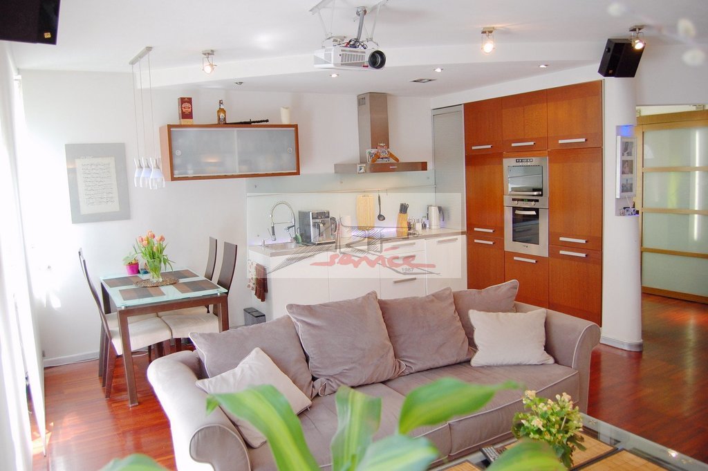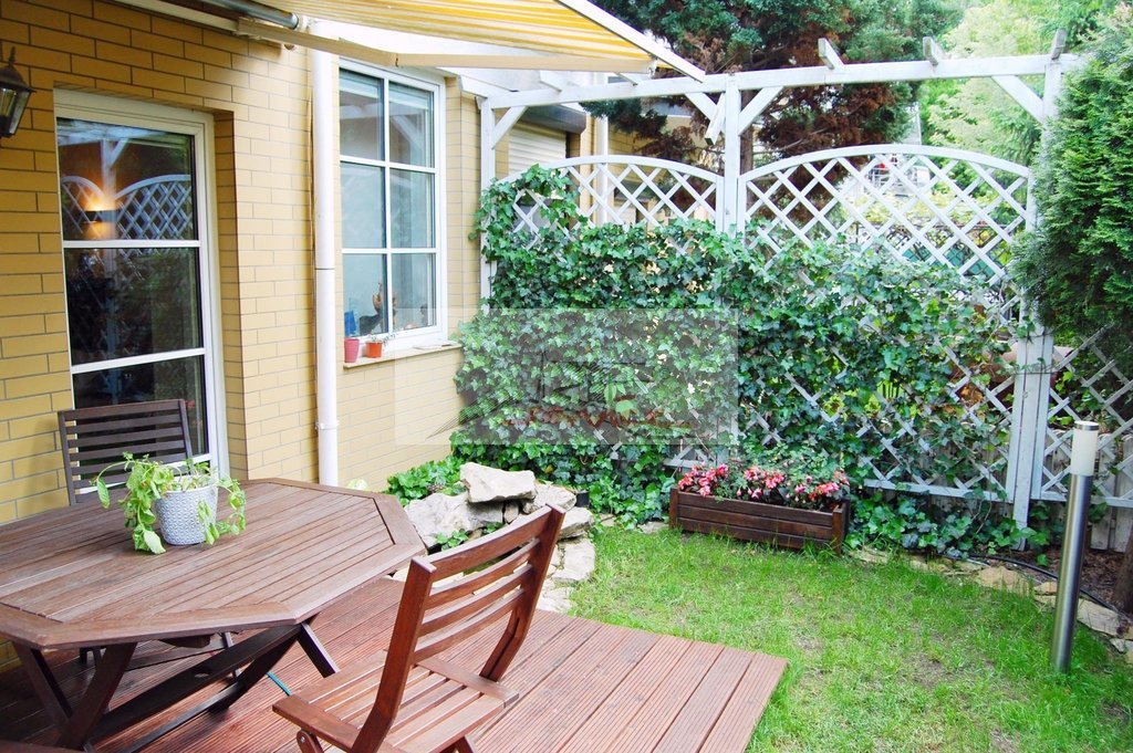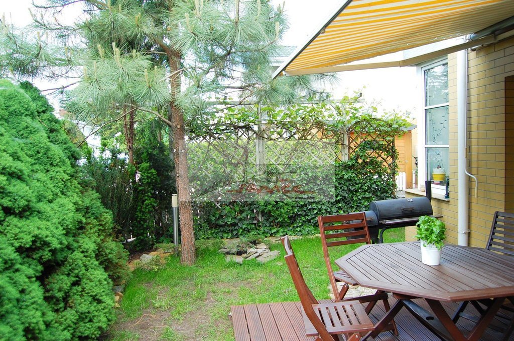 Doskonała lokalizacja kameralne osiedle (20 rodzin). Dom zatopionego w roślinności z prywatnym lasem i placem zabaw. Tuż przy osiedlu przystanki autobusowe - dojazd do metra Młociny 15min. Nieopodal większy plac zabaw, siłownia na powietrzu i nowe oświetlone boisko (koszykówka, siatkówka, piłka nożna, kort). W ogródku znajduje sie system nawadniający, oczko wodne z wodospadem i podświetleniem, deski tarasowe to świerk syberyjski, zamontowana jest także markiza szer. 3m. - wysuwa się na 240cm czyli praktycznie całą powierzchnię tarasu. Rośliny to bluszcz i winogrona od strony parkingu. 1 kondygn.40m2 = Pokój na dole z kominkiem i aneksem kuchennym. W zabudowie zmywarka 60cm Bosch i lodówka z zamrażarką (ma niecałe 2 lata) takze piekarnik z termoobiegiem , kuchenka mikrofalowa, płyta 4palnikowa elektryczna, okap Electrolux z wyciągiem podłączonym pod pion wentylacyjny. Poddasze 15m2. System wewnętrzny monitoringu. Całe osiedle także monitorowane - kamery. Podłoga w całym segmencie to parkiet merbau barwiony bejcą i schody dębowe także tą bejcą barwione. Parkiet merbau jest najbardziej higroskopijnym drewnem na świecie (nie kurczy się i rozpręża w znaczący sposób pod wpływem wilgoci lub suszy). W wyniku tego mimo 16 lat od położenia, pomiędzy żadną z deseczek nie ma żadnej szczeliny. Wszystkie drzwi w mieszkaniu i zabudowa szafy na dole i łazienki na piętrze robione przez jedna firmę na zamówienie. Na dole oryginalny kominek. Na parterze także oprócz szerokiej szafy na okrycia wierzchnie i obuwie toaleta i pomieszczenie gospodarcze. Różnorodne oświetlenie, w tym kolorowe, zciemnialne z dowolnego pilota(główne oświetlenie salonu). Instalacja podtynkowa HDMI pod projektor.