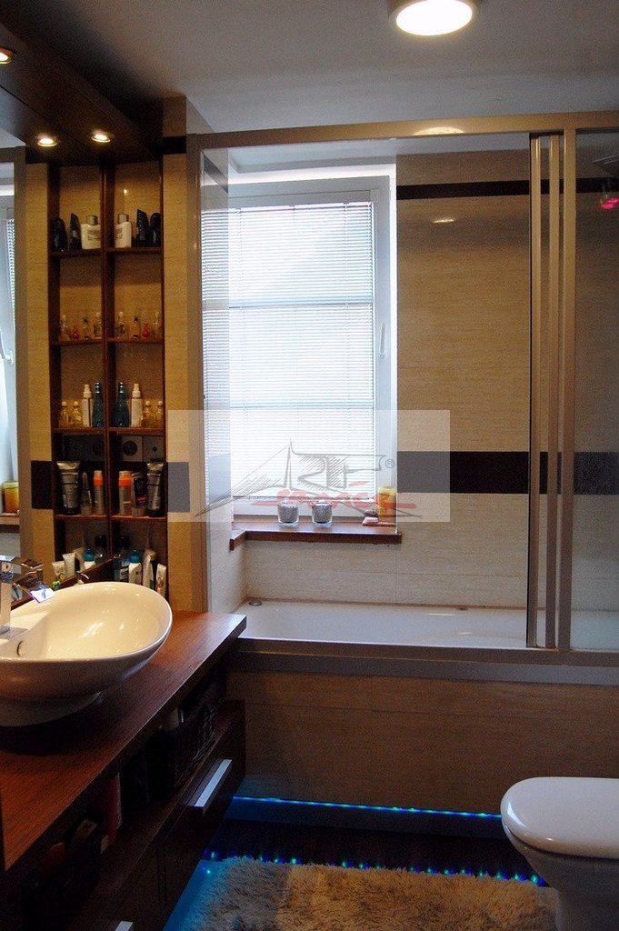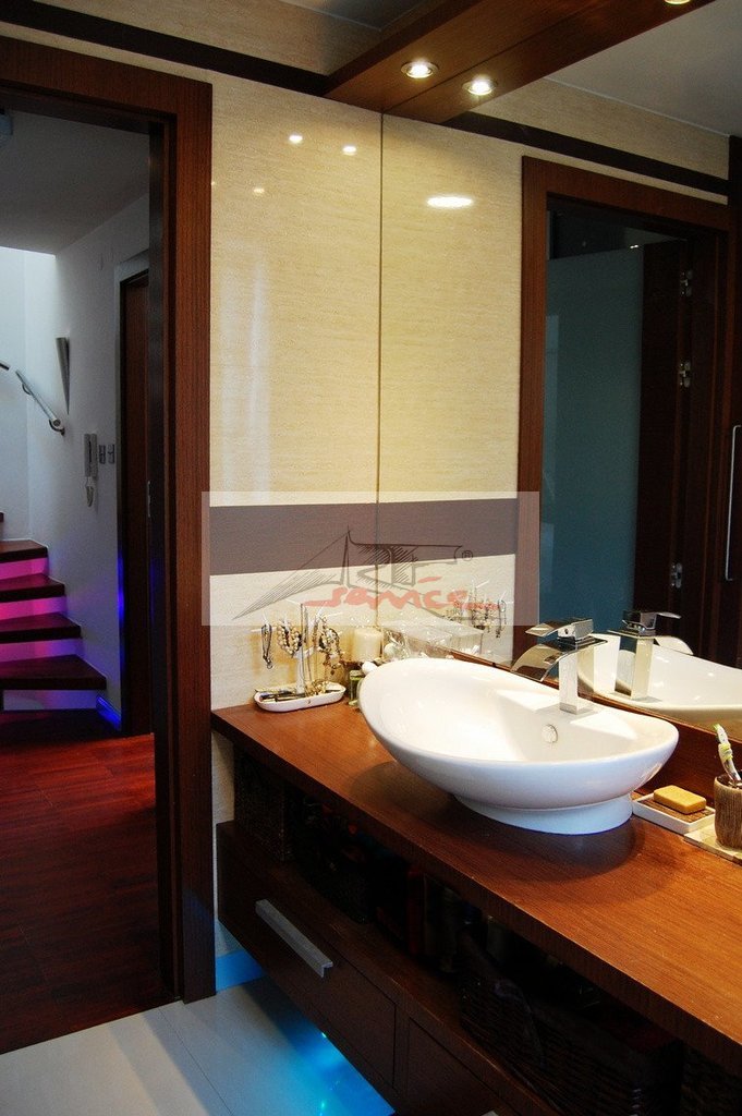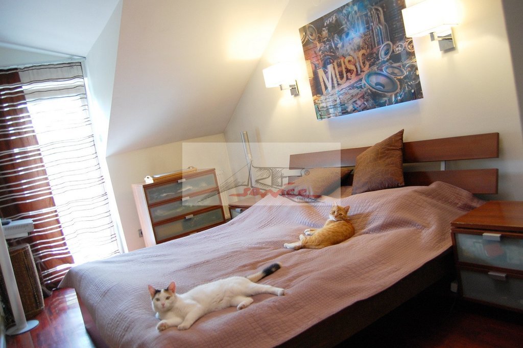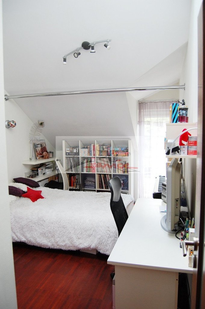 Na piętrze łazienka z wanną z hydromasażem zarówno powietrznym jak i wodnym stale serwisowana. Przy niej panel prysznicowy i drzwi pozwalające zamknąć całą przestrzeń wanny która w łatwy sposób staje się prysznicem. Duży blat umywalkowy i bardzo duże lustro. W łazience na piętrze także pralka Bosch, piec gazowy dwufunkcyjny(ogrzewanie, ciepła woda). 4 różne rodzaje oświetlenia, w tym kolorowe. Na pierwszym piętrze dwie bliźniacze sypialnie z oknami dachowymi. Wysokość w najwyższym miejscu ok.350cm! Okno balkonowe na wspólny balkon obu sypialni. Na ostatniej kondygnacji ostatnie pomieszczenie z jednym oknem, drugie okno połaciowe w przedsionku drugiej kondygnacji.
