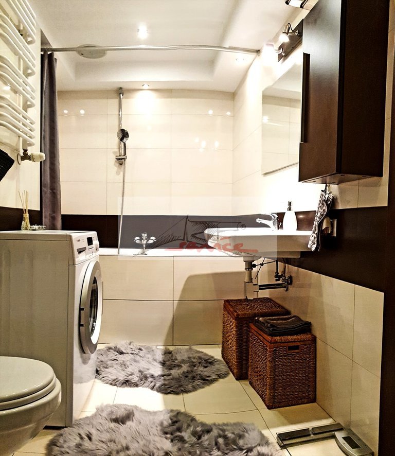 - sypialnia z łóżkiem małżeńskim, szafą, - łazienka z wanną, umywalką, pralką, szafką na kosmetyki,