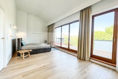 Poddasze użytkowe Sypialnia master (30m2) z wyjściem na taras (14m2) gabinet z przeszkleniem (antresola) lub garderoba (16,5m2). Łazienka (10,25m2), pomieszczenie gospodarcze pralnia i kotłownia, (7,65m2), hol. Razem 77,55m2.