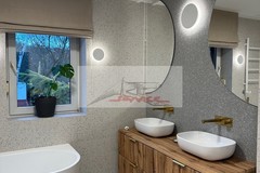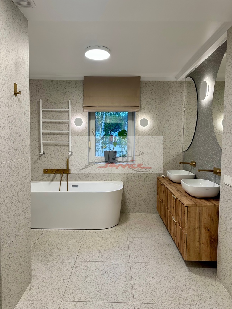 Na wyższym parterze zlokalizowany jest ogromny salon z aneksem kuchennym oraz pokojem gościnnym, słoneczny pokój i WC.