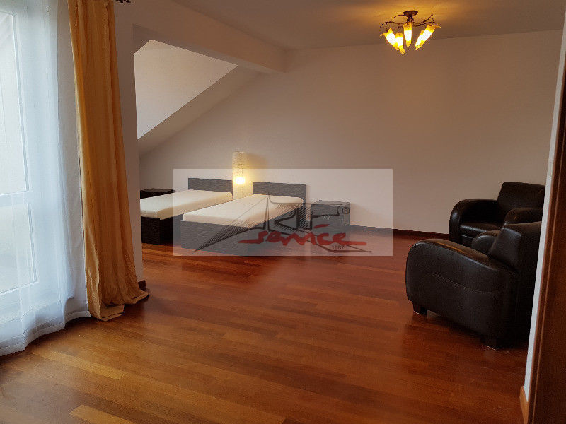 Piętro 2e łazienka (umywalka, bidet, prysznic, wanna), 1 sypialnia, 1 salon z tarasem może być wykorzystywany również jako sypialnia, pokój gościnny lub rekreacyjny (wyposażony w 2 łóżka z szafkami nocnymi), garderoba. (Okna na poddaszu proste.). Z salonu wyjście na duży, kameralny taras osłonięty z dwóch stron z pięknym widokiem.
