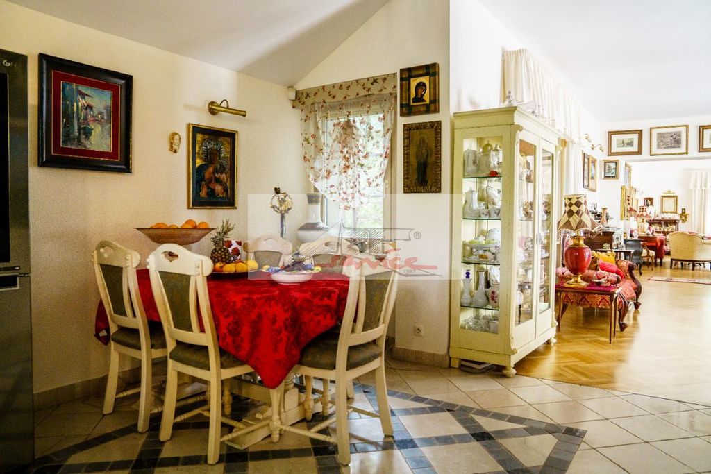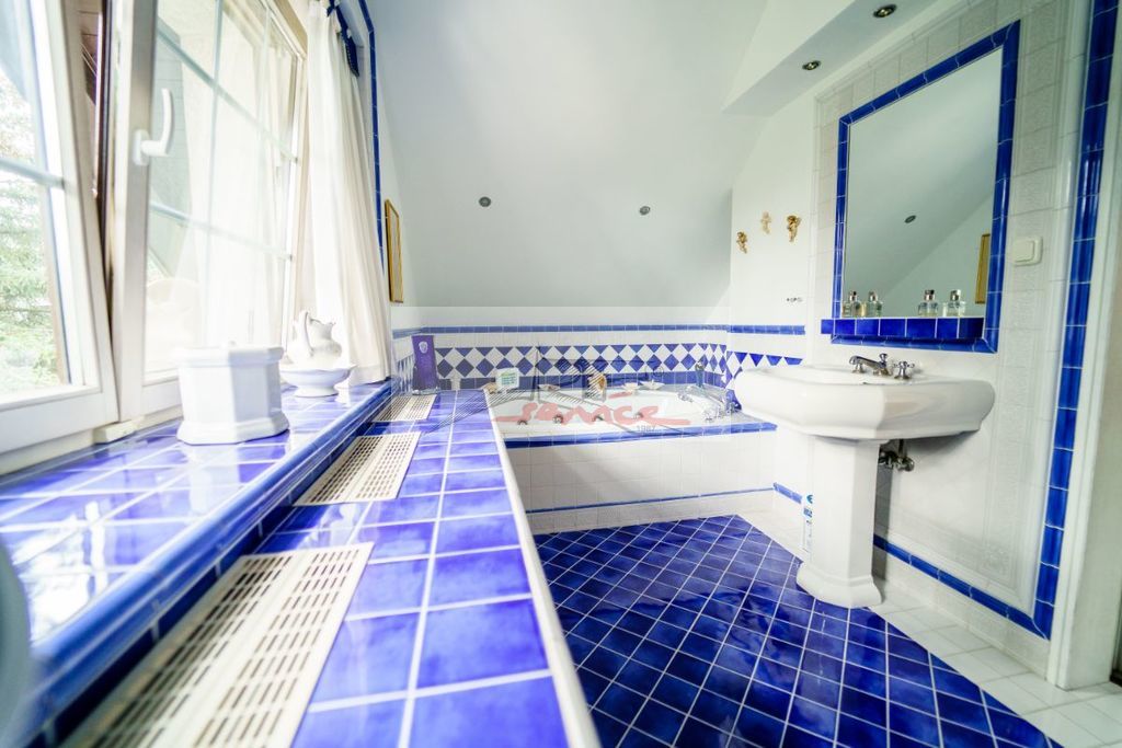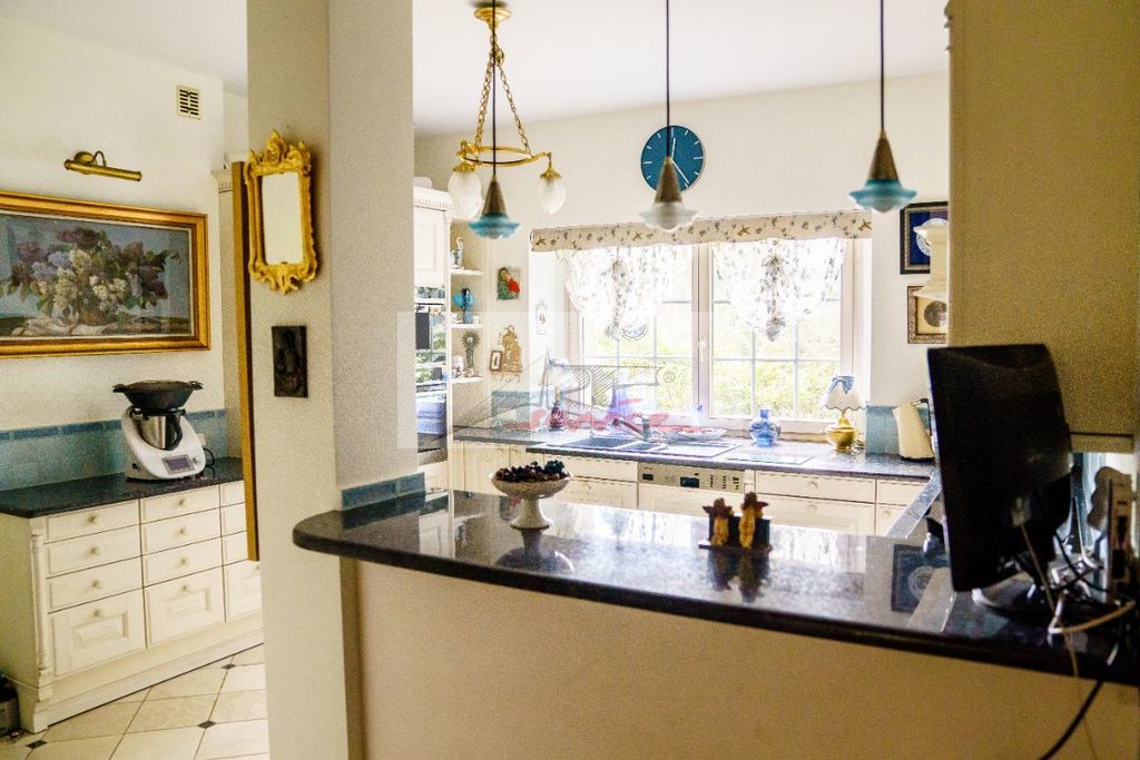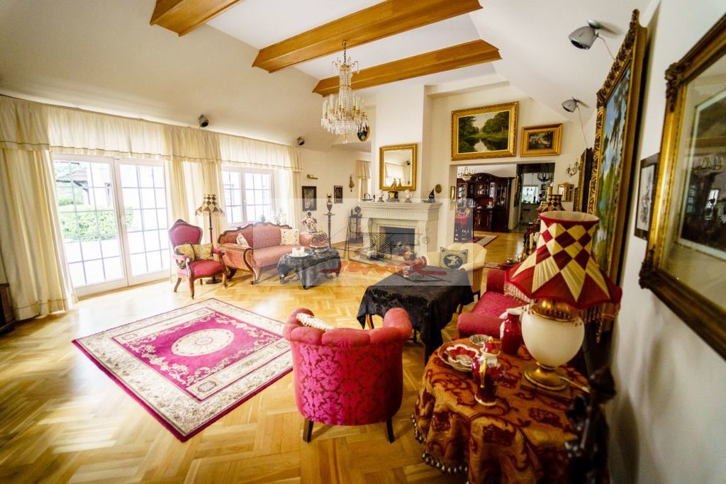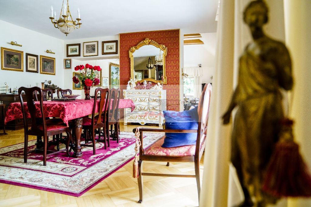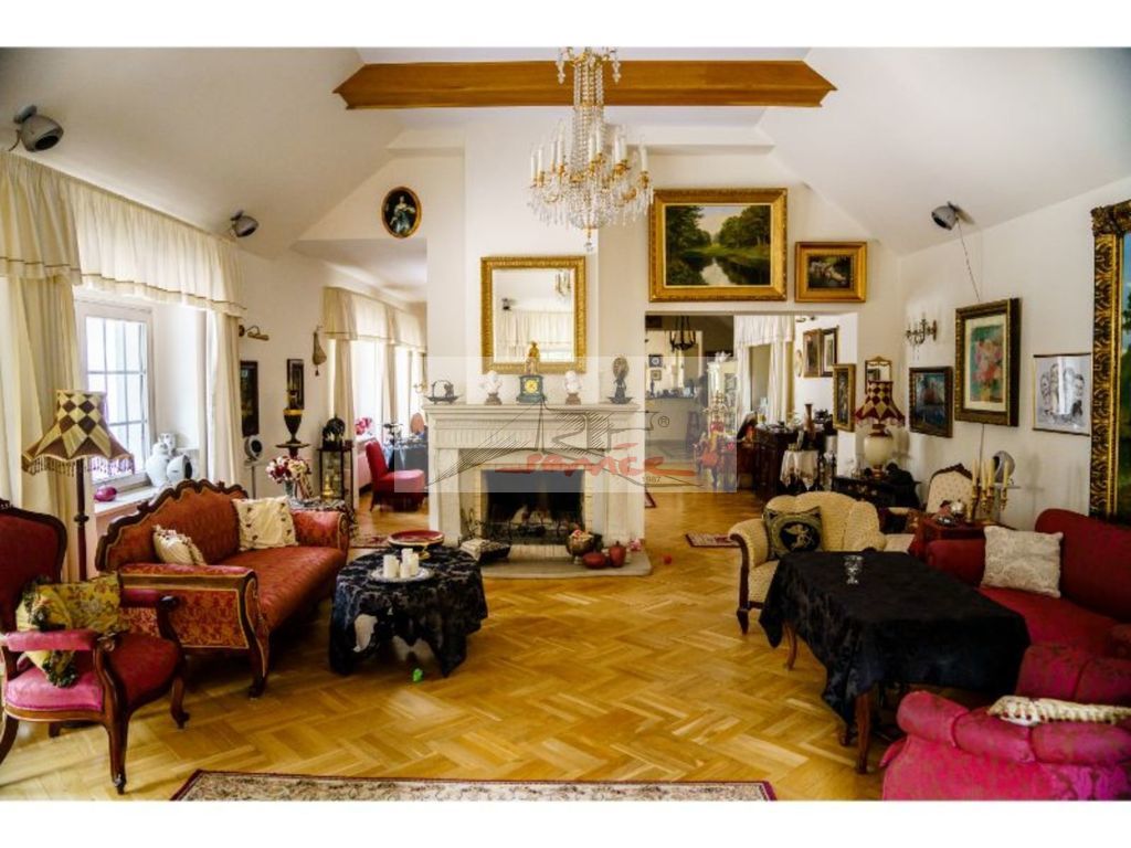 Dom posiada 4 kondygnacje przyziemie, parter, piętro oraz strych (nie liczony w powierzchni). Pierwsze piętro to część ściśle prywatna. Tu znajdują się m.in. 3 ogromne sypialnie (jedna z prywatną łazienką oraz garderobą), salon kąpielowy i pokój gościnny. Wszystkie sypialnie posiadają wykładziny, a łazienki mają podgrzewane podłogi. Pokoje połączone są również ciągiem balkonowym w typie krużganka, znajdującego się nad tarasem. Parter jest przestrzenią niezwykle reprezentacyjną. Po wejściu do domu, przechodząc przez hall wchodzimy do dwóch ogromnych salonów (90 m2) połączonych ze sobą w amfiladzie. Obok znajduje się obszerna kuchnia z jadalnią i spiżarnią (31 m2). Na parterze znajduje się również łazienka, pokój gościnny oraz niezwykle duży gabinet/biblioteka (55 m2). Podłogi na tym piętrze są drewniane (dąb, bambus) i marmurowe. Podłogi kamienne są podgrzewane. Wysokość pomieszczeń parteru to 292 i 335 cm. Dom ma układ litery "U", więc z obu salonów czy hallu można wyjść na przestronny taras-patio. Można tam usiąść, napić się kawy i podziwiać piękny ogród w niezakłóconej, intymnej atmosferze. Wielkość tarasu (ok 150 m2) pozwala na wygodne urządzanie dużych przyjęć plenerowych - kamienne szerokie schody prowadzą do głównej części ogrodu. Centralnie pod trasem został umiejscowiony nowoczesny, duży basen o wymiarach 12.5 na 4 m. Hala basenowa jest klimatyzowana i wentylowana za pomocą profesjonalnej centrali klimatyzacyjnej Menerga. Woda jest niezależnie podgrzewana, a w pomieszczeniu panuje zadana temperatura i wilgotność. Z basenu można wyjść bezpośrednio do ogrodu. Obok basenu znajduje się sala kinowa z nagłośnieniem Dolby Atmos, siłownia, a dalej dwie sauny- parowa i sucha wraz z prysznicem. Na tym poziomie znajduje się również duża pralnia, wc, natrysk, pomieszczenia gospodarcze i techniczne Dom posiada również garaż z dwoma bramami, w którym bez problemu zmieszczą się 2 duże limuzyny lub vany.W tylnej części dom posiada osobne mieszkanie - służbówkę z niezależnym wejściem, posiadające pokój, kuchnię i łazienkę. Niezwykła zaletą rezydencji jest lokalizacja. W najbliższej okolicy znajdują się wszelkie udogodnienia. Nieruchomość posiada KW oraz jedynego, prywatnego właściciela. Istnieje MPZP. Brak jakichkolwiek wad prawnych, obciążeń lub służebności. Teren jest oznaczony symbolem 7.4 MN(U).