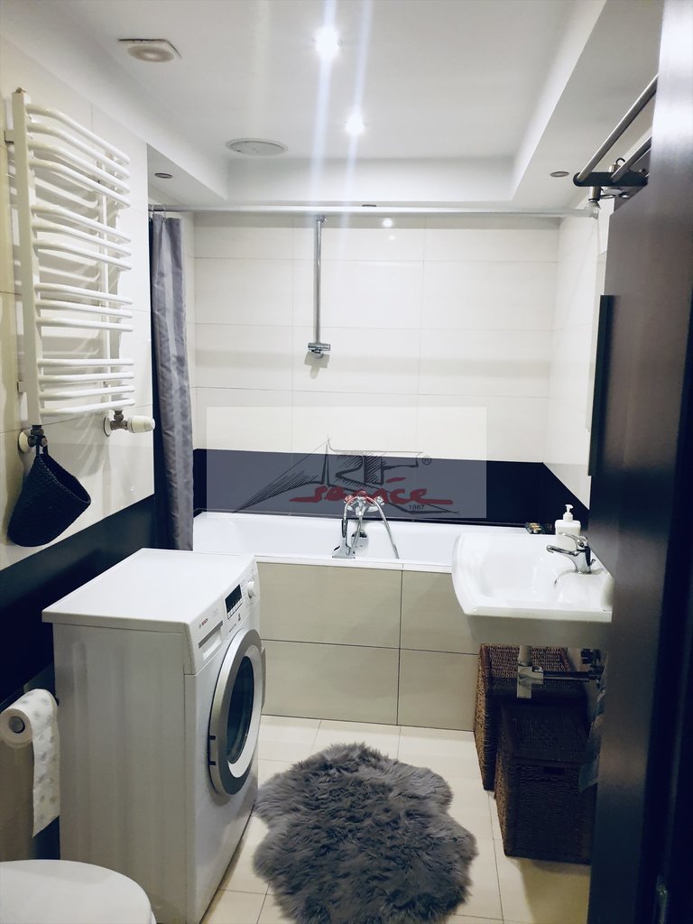 - sypialnia z łóżkiem małżeńskim, szafą, - łazienka z wanną, umywalką, pralką, szafką na kosmetyki,