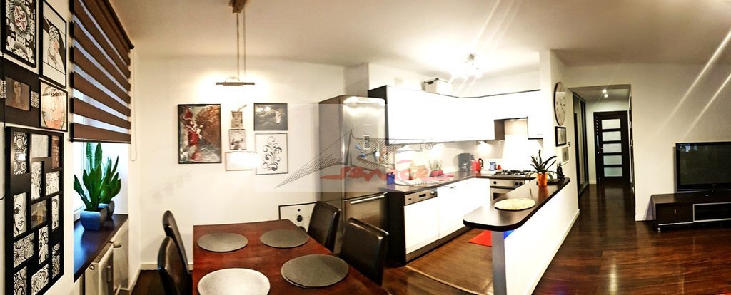 - salon połączony z kuchnią z kompletem meblowym (stół, krzesła, komoda RTV, kanapa, stolik kawowy, fotele),