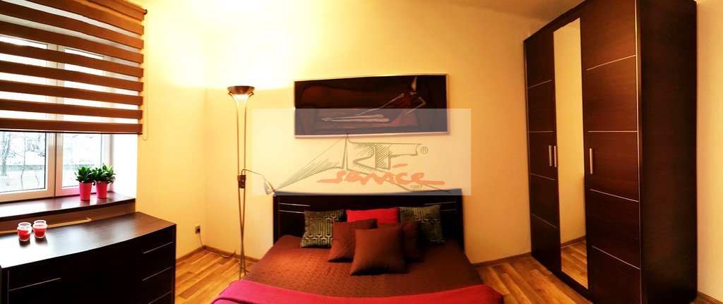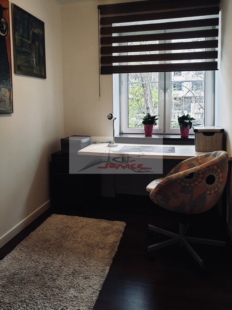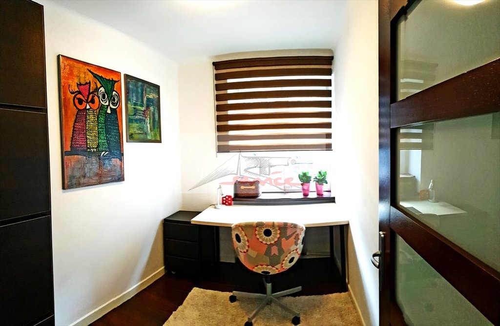 - mała sypialnia, obecnie pokój biurowy z komodą, szafą typu biblioteka, półkami na książki, fotelem. Czynsz 650,-pln.