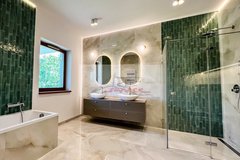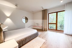 Pierwsze piętro 3 sypialnie (23,35 18,40 16,65m2), każda z nich w wyjściem na balkon/taras, salon kąpielowy (14,40m2), garderoba (6,9m2), hol. Razem 92m2.