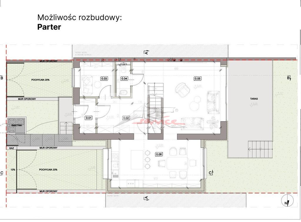 Nawet bez przebudowy, obecny rozkład pozwala na uzyskanie aż 6 pokoi - wystarczy podzielić jeden z pokoi na pierwszym piętrze.
