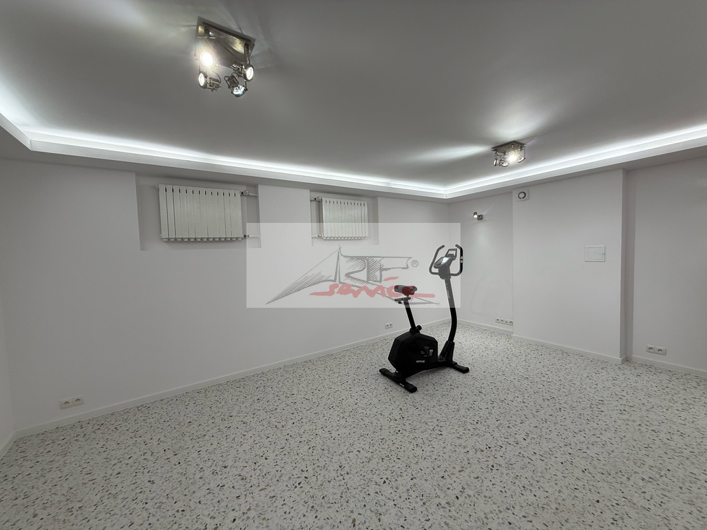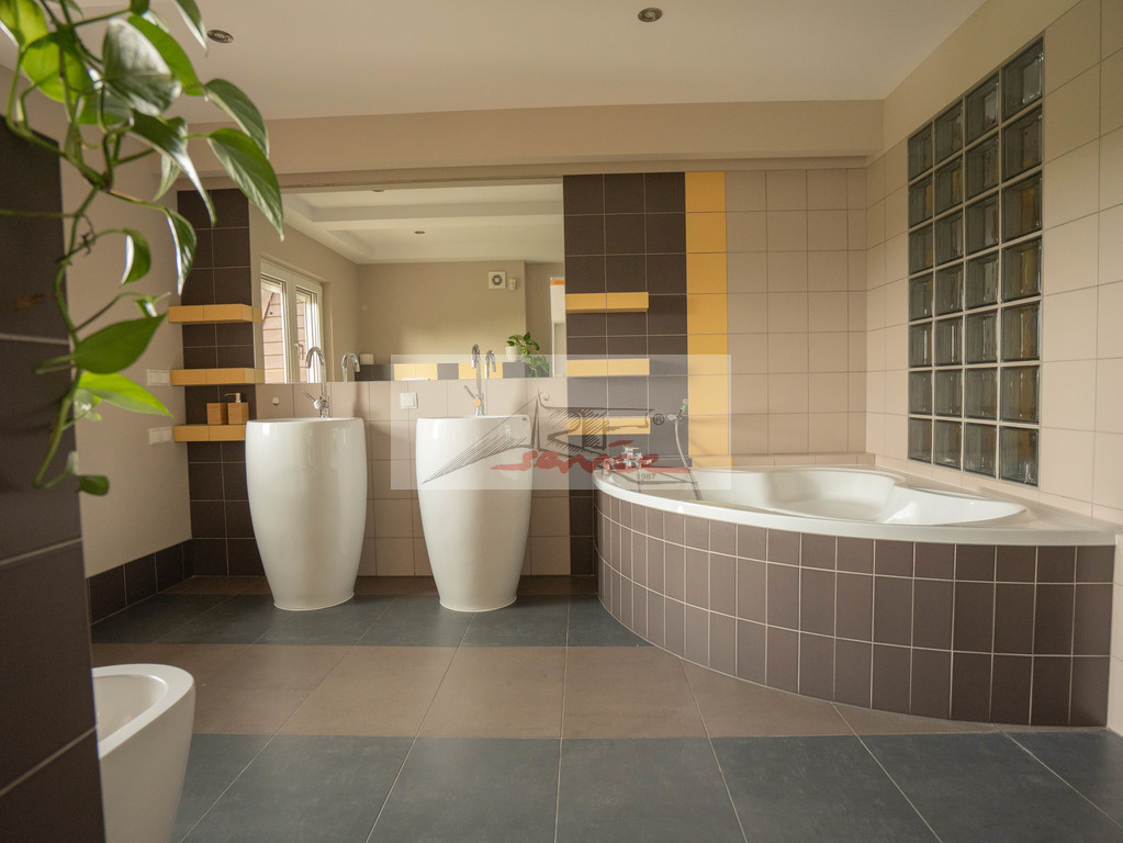 Przyziemie fabrycznie nowa sauna fińska, rozległy salon relaksu, łazienka z prysznicem, pralnia, kotłownia, filtrowanie i uzdatnianie wody, spiżarnia.