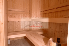 Przyziemie fabrycznie nowa sauna fińska, rozległy salon relaksu, łazienka z prysznicem, pralnia, kotłownia, filtrowanie i uzdatnianie wody, spiżarnia.