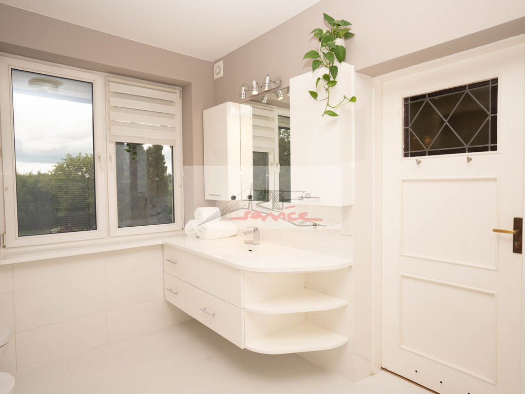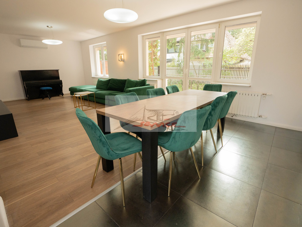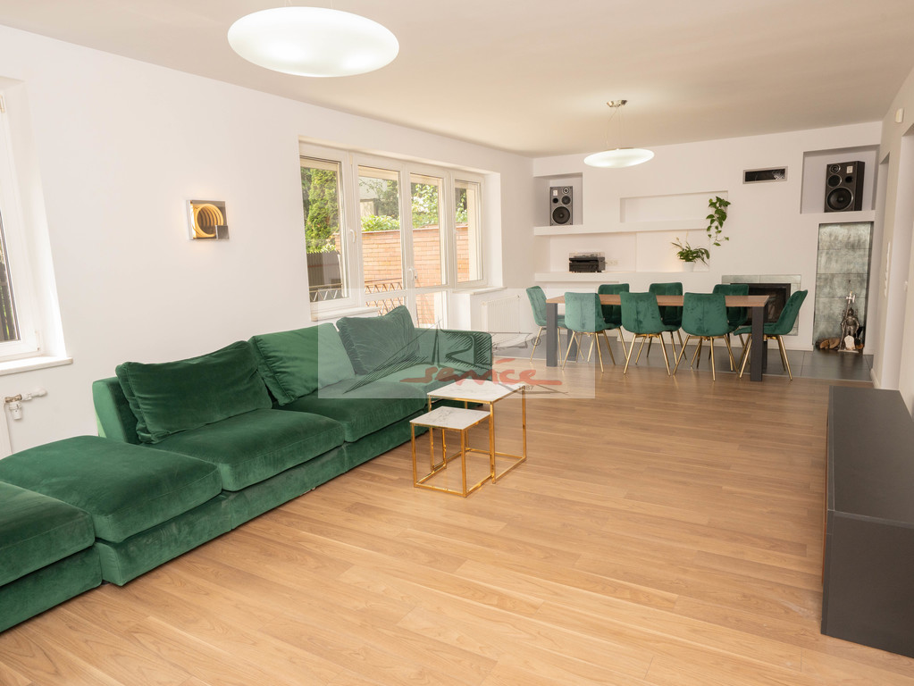 Piękna lokalizacja z widokiem na Park. Blisko centrum handlowe Sadyba Beat Mall, dobra komunikacja, 6km do centrum. Doskonały do zamieszkania i rekreacji, blisko jeziorka i plaży oraz ośrodka tenisowego. Nowoczesny dom, elegancko wykończony. Duży salon z kominkiem wyjście do ogrodu. Trzy piętra i obszerna piwnica, trzy łazienki i WC. Centralnie sterowane rolety i ogrzewanie. Nowa sauna i klimatyzacja (7 jednostek), kominek, garaż, pianino, woda pitna z kranu. Garaż plus miejsca parkingowe na podjeździe.