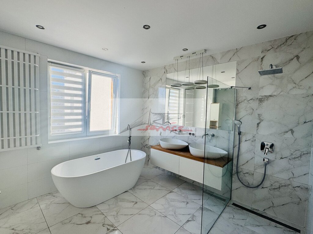 Piętro - trzy sypialnie, w tym jedna główna z garderobą, własną łazienką i wyjściem na taras, - druga łazienka z wanną i prysznicem.