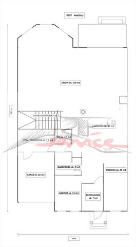 - garderoba o pow. 5 m2 - jasny gabinet o pow. 15 m2 - łazienka o pow. 6 m2 - kotłownia z pralnią o pow. 7 m2 z indywidualnym przejściem do garażu o pow. 20 m2 - duża i widna kuchnia o pow. 25 m2 przylegająca do wielkiej jadalni połączonej z salonem - ogromny i ciekawy w kształcie salon pałacowy o pow. 120 m2 (z doświetlonym wykuszem, instalacją kominkową oraz stylową kolumną), z szerokim wyjściem do ogrodu.