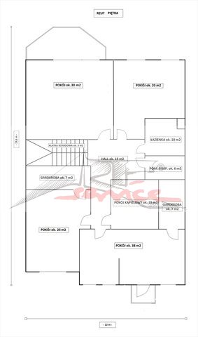 I. piętro domu to - centralnie umiejscowiony, przestronny hall o pow. 18 m2 - jasny o pow. 30 m2 z widokiem na ogród i dużym tarasem nad wykuszem - widny pokój o pow. 20 m2 - pełna łazienka o pow. 8 m2 - ogólna garderoba o pow. 6 m2. - boczny korytarz z centralnego hallu prowadzący do głównej sypialni - główna sypialnia o pow. 30 m2 z wydzieloną częścią dzienną i indywidualną garderobą o pow. 5 m2